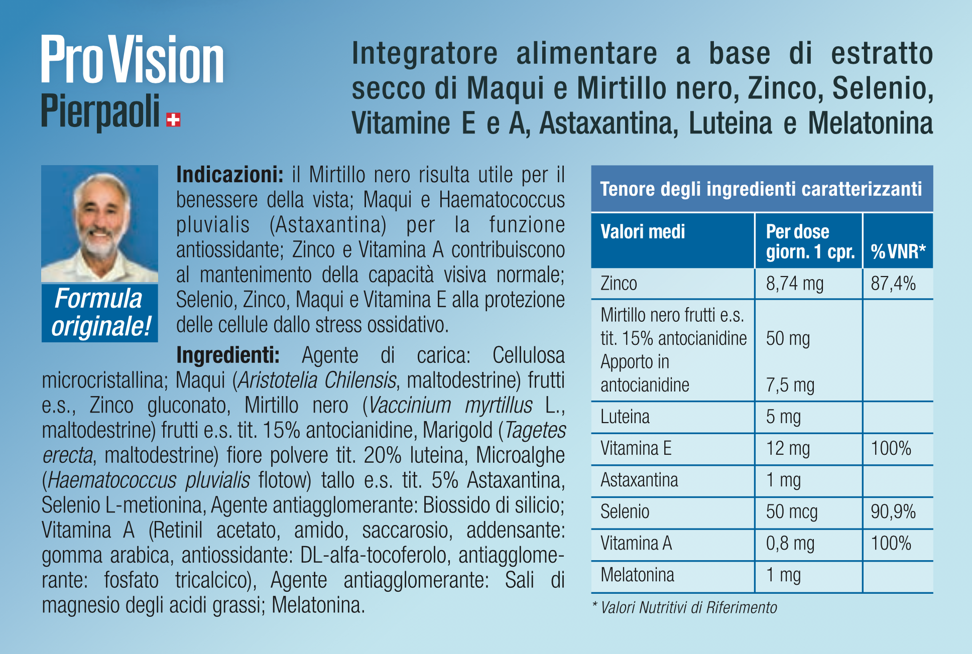 ProVision® is an innovative formulation created to preserve eyesight. Food supplement with dry extract of Maqui and Blueberry, Zinc, Selenium, Vitamins E and A, Astaxanthin, Lutein and Melatonin.